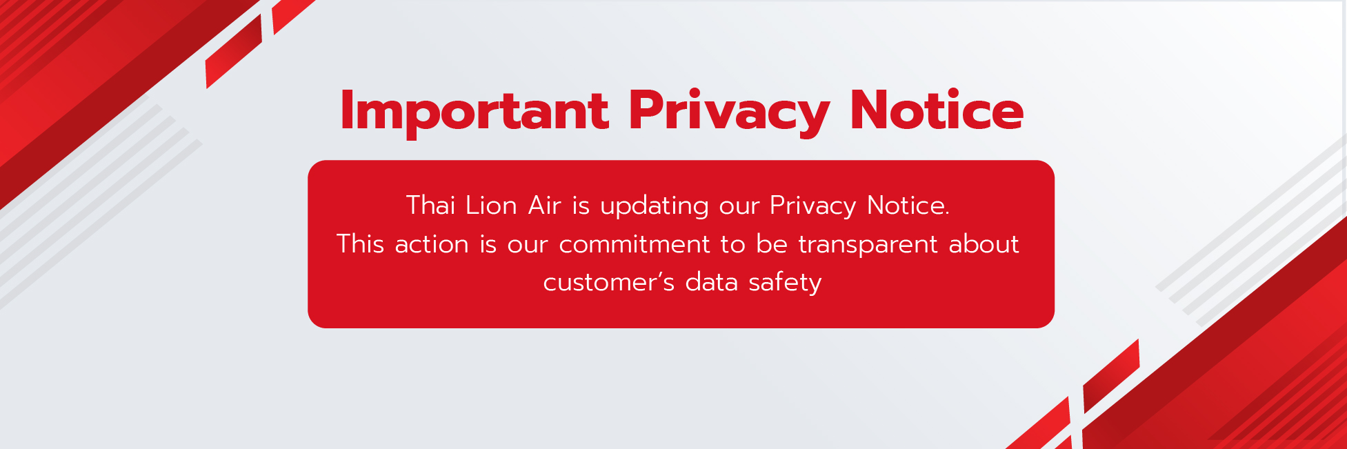 To keep up with any development or change in the future, Thai Lion Air reserves the right to change, amend and/or vary this Privacy Policy at any time and will notify users of the same by updating the Privacy Policy here and by including a "NEWLY UPDATED" label with the "PRIVACY POLICY" link on the web sites governed by this Privacy Policy for a period of 30 days.