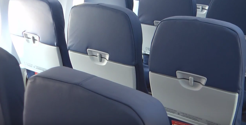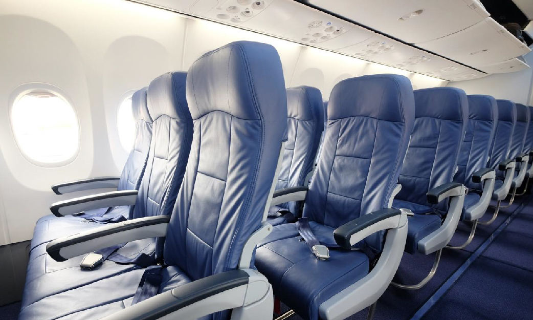 Reclining leather seats with seat pitch of 29" and seat width of 17" for Economy class.