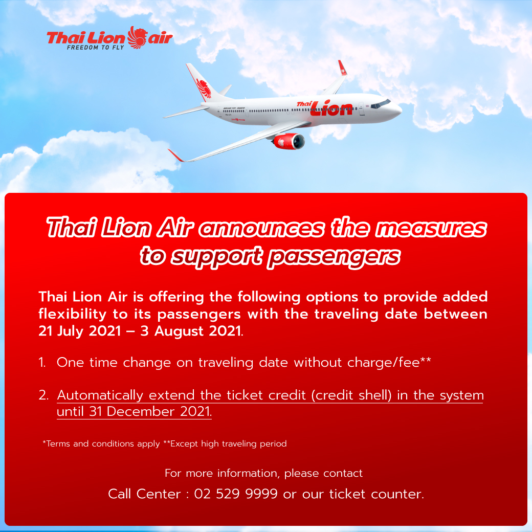 Thai Lion Air is offering the following options to provide added flexibility to its passengers with the traveling date between 21 July 2021 – 3 August 2021.