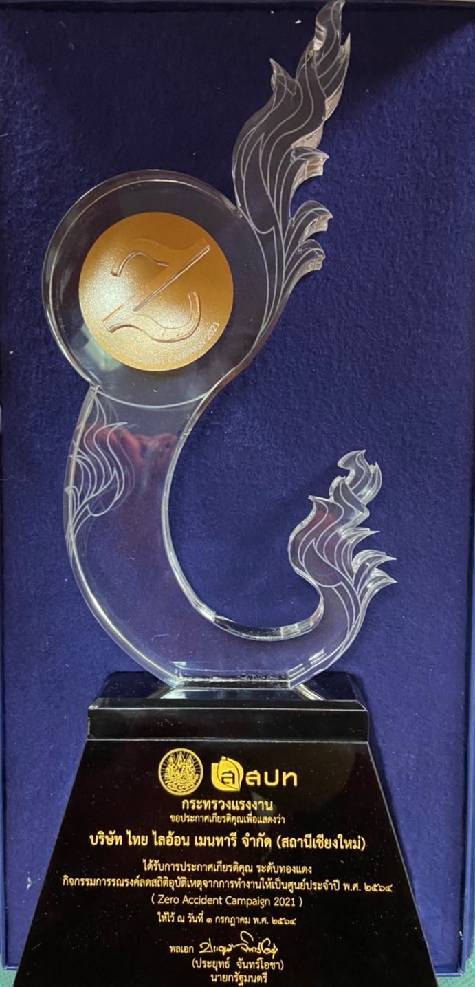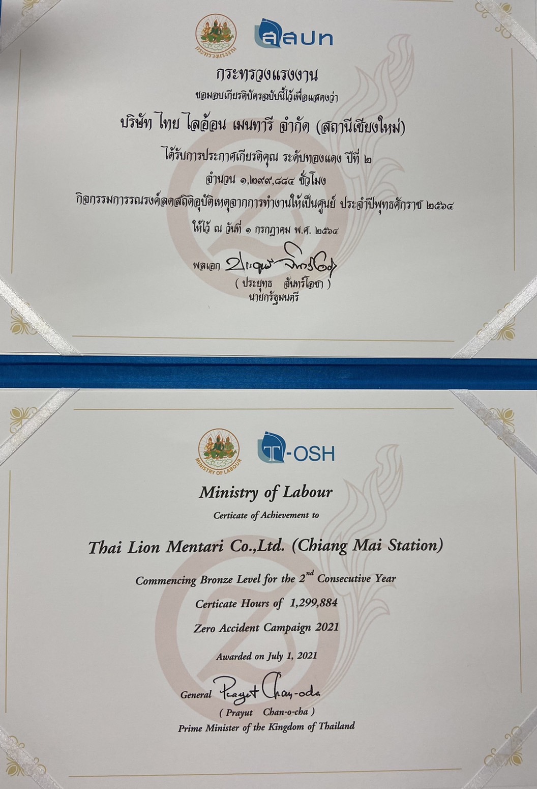 Thai Lion Air, Chiang Mai station awarded a Bronze Level Shield and certificate for 2nd consecutive years with a record of 1,299,884 hours without any accidents from the Ministry of Labor. In the campaign to reduce accidents from work to zero for the year 2021 (Zero Accident Campaign 2021)
