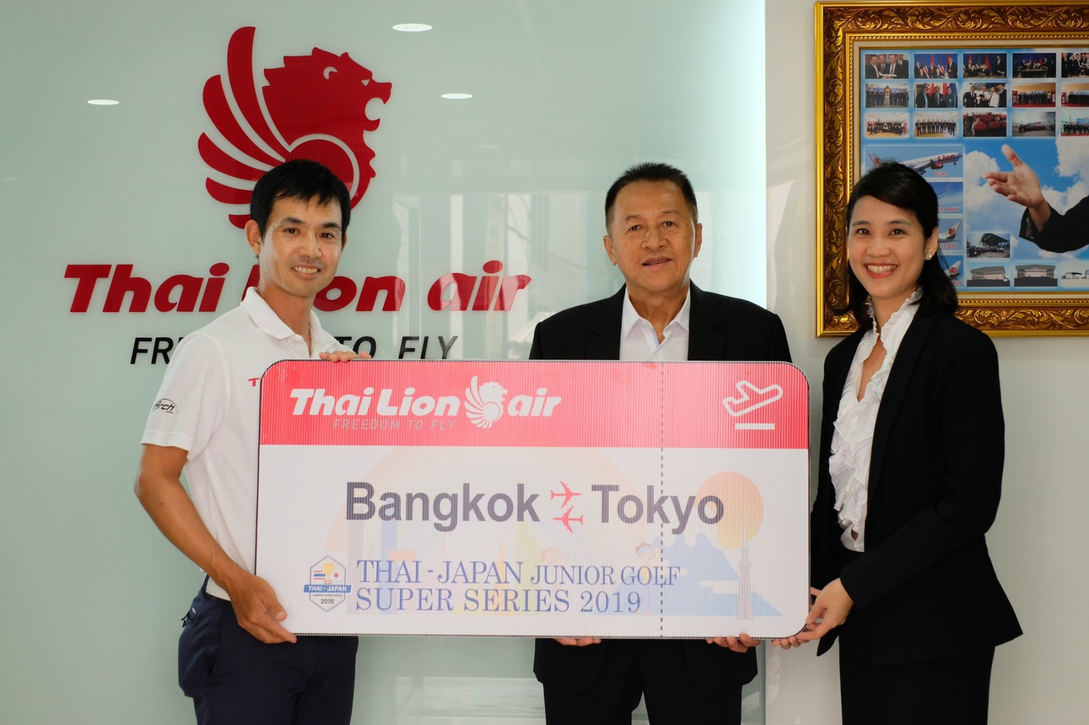 Mr. Aswin Yangkirativorn, Chief Executive Officer of Thai Lion Air and Mrs. Nuntaporn Komonsittivate, Head of Commercial of Thai Lion Air sponsored complimentary tickets Don Mueang-Tokyo (Narita) and congratulations with Thai youth who won Golf Tournament Thai-Japan Junior Super Series 2019 and those winners will be representative of Thai youth to have next competition in Japan.