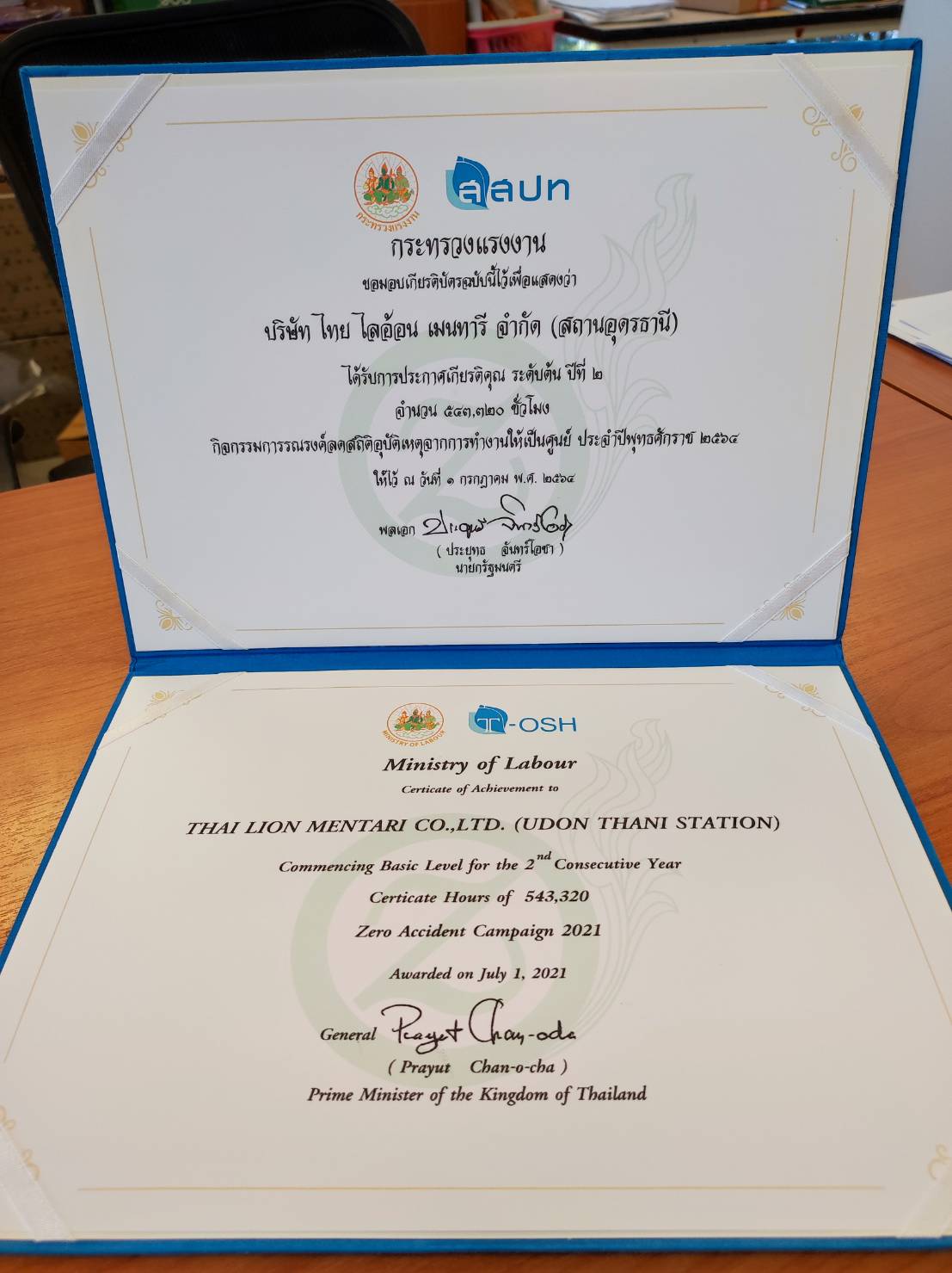Thai Lion Air, Udon Thani Station received a certificate In the Zero Accident campaign, (Bronze Medal) for 2nd consecutive years with a record of 543,320 hours without from the Ministry of Labor In the campaign to reduce accidents from work to zero for the year 2021 (Zero Accident Campaign 2021)